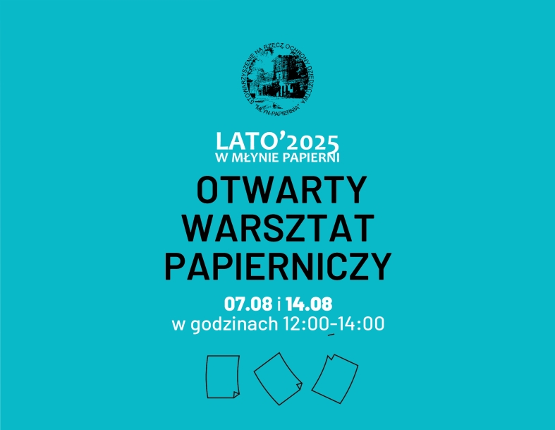 W dniach 7 i 14 sierpnia w godzinach 12:00 – 14:00 w Młynie Papierni rusza Otwarty Warsztat Papierniczy. Każdy z odwiedzających będzie miał możliwość spróbować swoich sił w czerpaniu papieru. Zapraszamy!